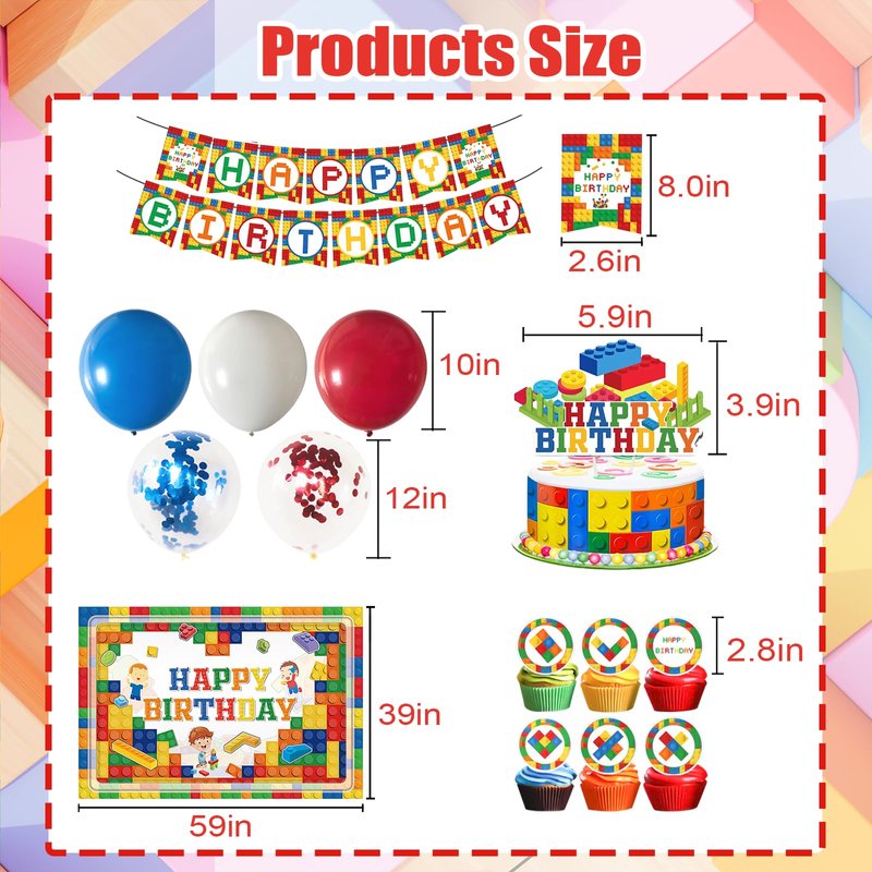 - Colorful Creative Design: Building block birthday party supplies feature building block patterns on the backdrop and banner, plus red, blue, and white balloons. This party supplies set perfectly matches the theme. The vibrant colors and fun designs create a lively atmosphere, ideal for photos and lasting memories