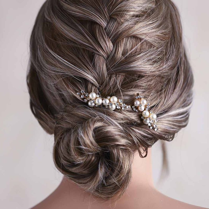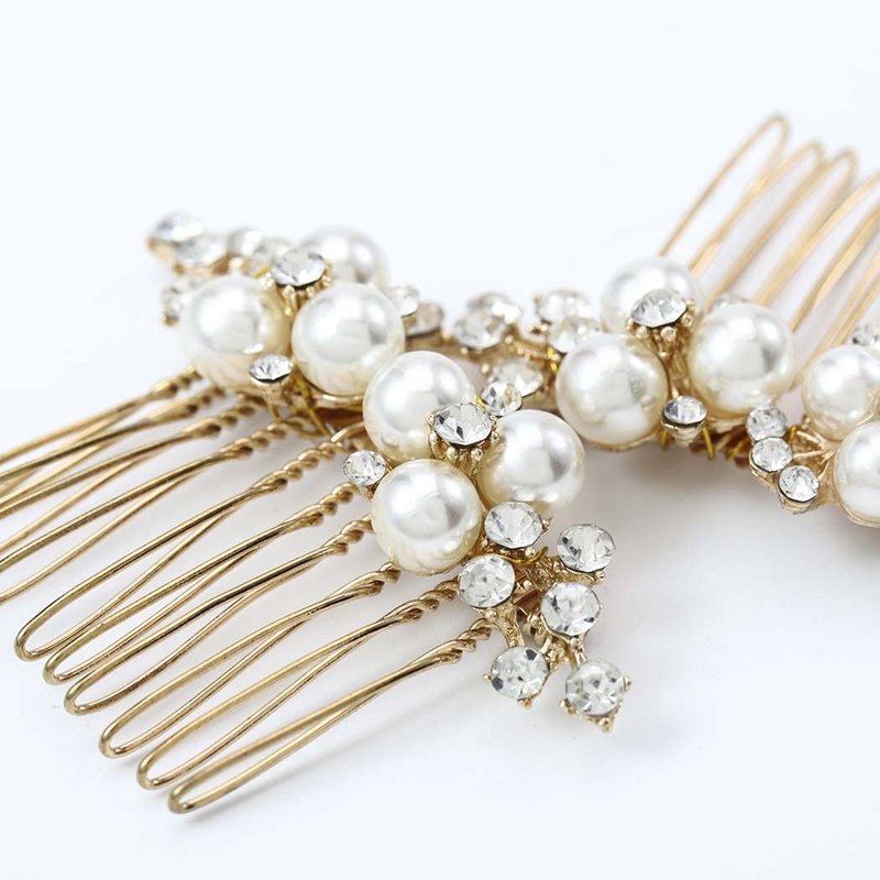 - Gold bride hair combs have sophisticated varying sizes of clear rhinestones wired together,sparkling crystal and unique pearl design.People will take more eyes on you when you wearing the special accessory.