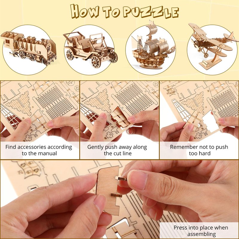 - DIY and Funny: the wooden train model, airplane model kits, ship and model car to build are realistic and can maintain a nice natural wood state after finishing, can be regarded as meaningful collections and souvenirs; Or you can paint them according to your preference, which can make them more attractive and special; Our can also serve as a form of relaxation and stress relief, help you find the process of solving them to be soothing and meditative