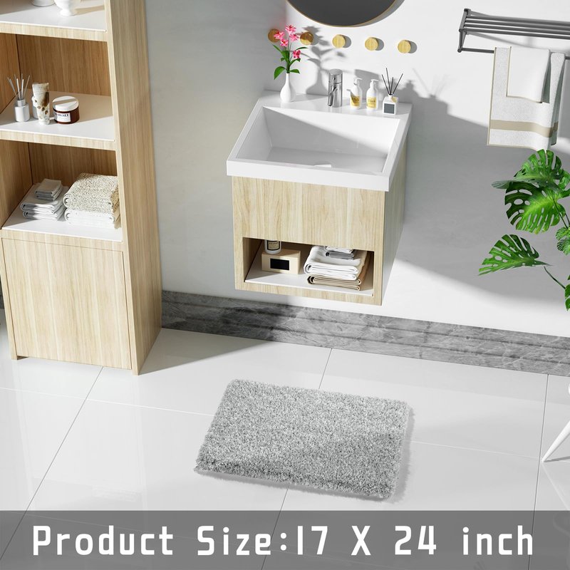 Yimobra Luxury Bathroom Rugs, Shaggy Bath Mats, Non Slip, Water Absorbent Microfiber, Machine Washable, Fluffy Plush Soft Shower Rugs, Thick Floor Mat, 17"x 24", Light Gray&White