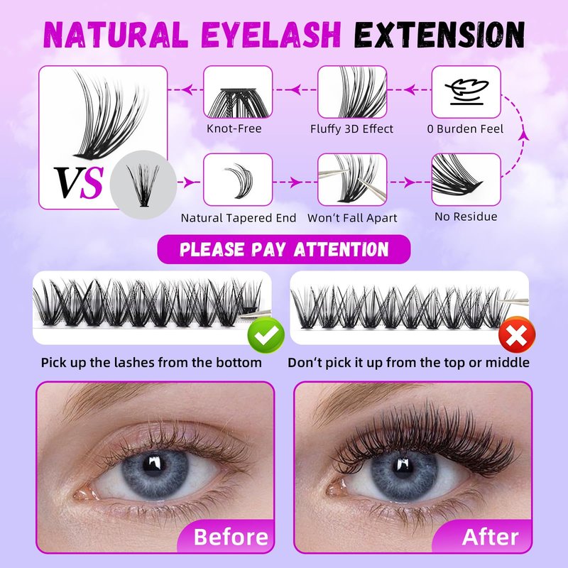 - 【High Quality cluster lashes】:Our DIY eyelash extension pack are made of synthetic fibers, to ensure softness, thickness, durability and longevity. Our eyelashes remain perfectly curled, ensuring long-lasting retention and waterproofing.At the same time, the lash clusters do not fall apart when picked up from the strip or taken off from the eyes.