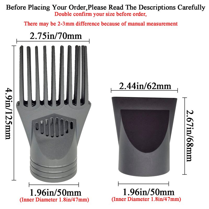 - π[Package]: You'll get 2 pcs Black Plastic Hair Dryer Narrow Concentrator Nozzle, One size: 50x60x68 mm/1.96x2.44x2.67 inch The other size: 50x74x75 mm/1.96x2.91x2.95 inch