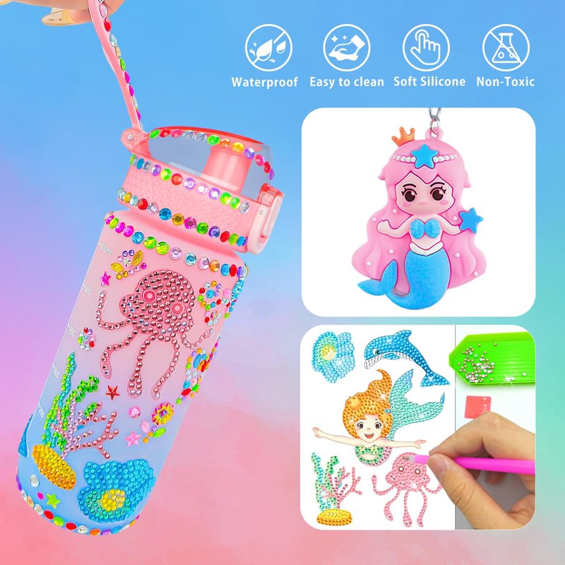 - [Rich DIY water bottle set]: Our DIY water bottle set includes a sturdy and leak-proof 600 ml water bottle, 1 professionally designed diy mermaid underwater series diamond set, 3 sparkling gem stickers, and 1 cute mermaid silicone keychain charm , 1 complete DIY kit, 1 high-quality water bottle cleaning brush, 1 DIY name letter sticker, colorful diamond pack in various colors.