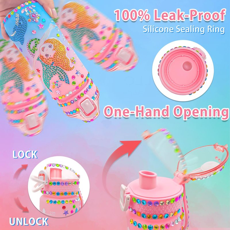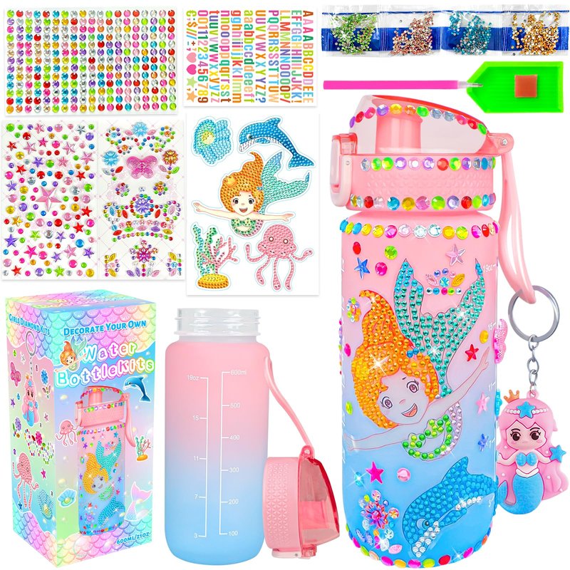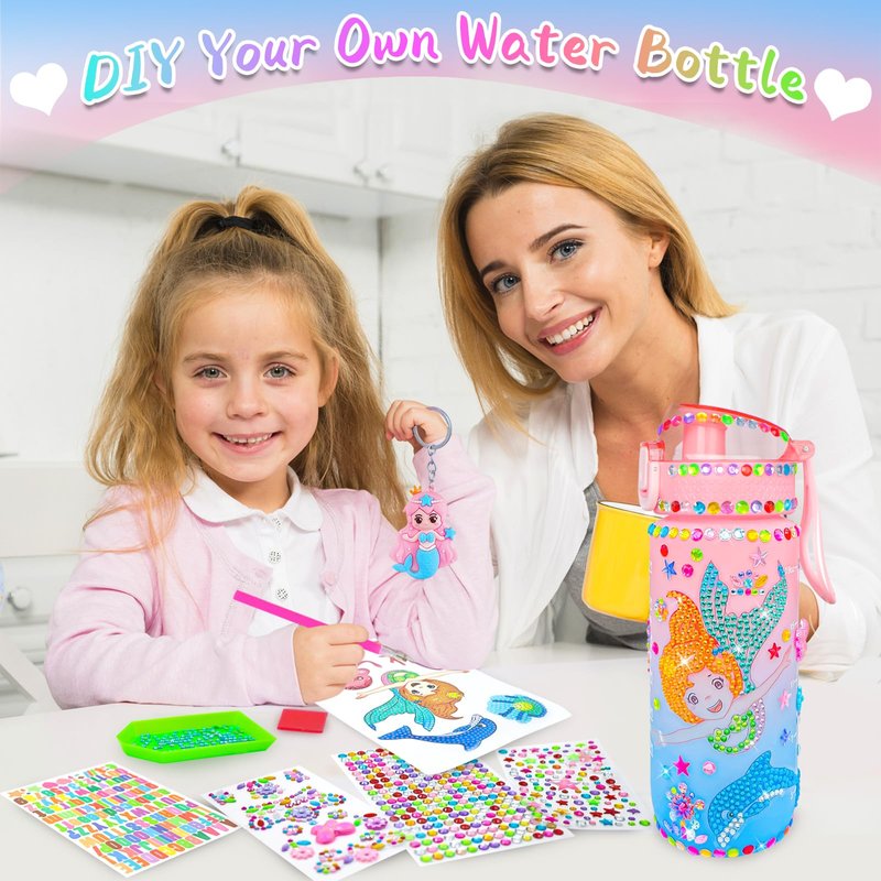 - [Decorate Your Own Water Bottle Kits]: The design of our DIY water bottle kit by the mermaid theme that little girls love. The kit includes colorful and sparkling diamond stickers that add uniqueness to your child's water bottle, let your child's imagination and creativity to be fully utilized and satisfied, creating a one-of-a-kind mermaid water bottle.