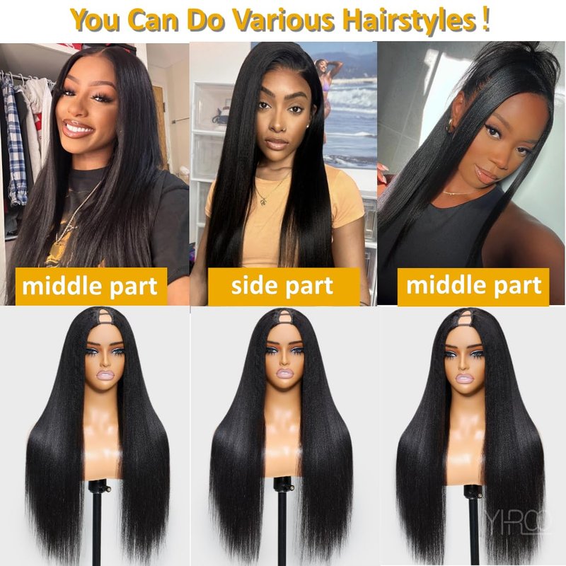 - 【V Part Wig Human Hair Materials】New yaki human hair wigs,100% brazilian virgin human hair wigs,upgrade u part wig,no glue no leave out,blend with your real hairline,no tangle and shedding,soft, healthy and comfortable,can be restyled and dyed.