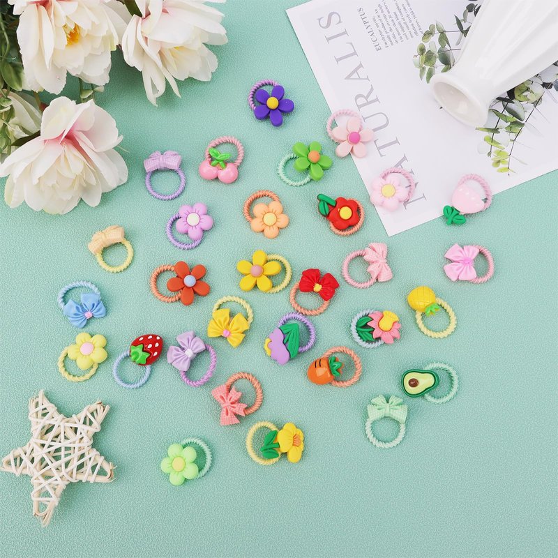 - Package: 60pcs girls hair ties with cartoon flower, bow and fruits. A variety of styles and colors for girls to match with different clothes.