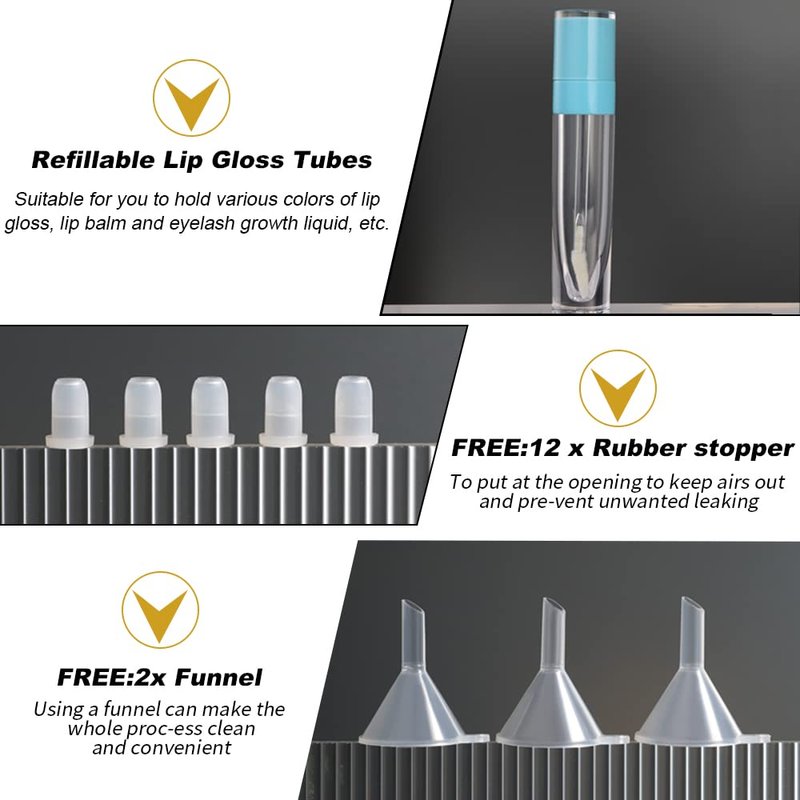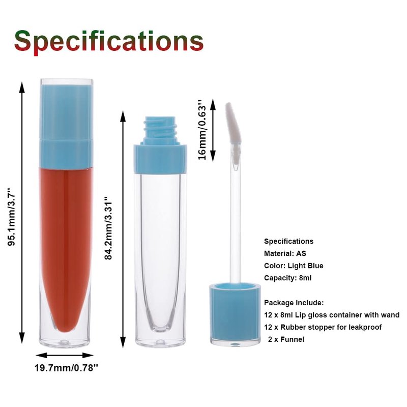1. Refillable Cosmetic Containers 8ml - The empty lip gloss tubes are made of high-grade AS material, with 12 pieces rubber stopper for leakproof and 2 pieces Funnel.