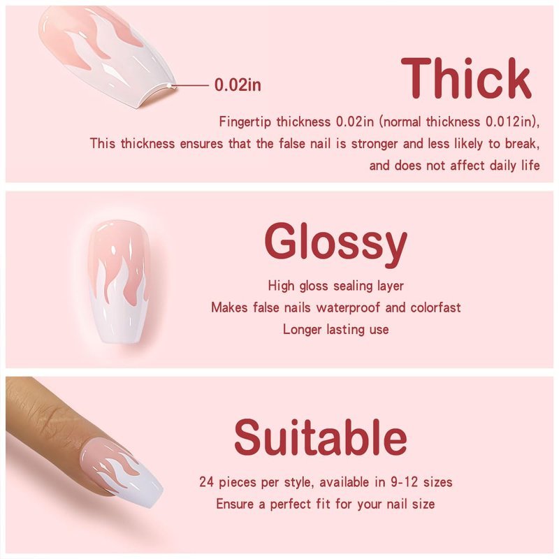 - 🌟press on nail kit: 24pcs/12 sizes of pink press on nails (multiple sizes to fit your nails comfortably), 1 nail file, 1 glue stick, 24 pieces of jelly glue. 1 cleaning cloth, 1 wooden stick. (jelly glue is not as durable as liquid glue, but it allows the french tip nails to be reused, so please use the appropriate glue for different scenarios.)