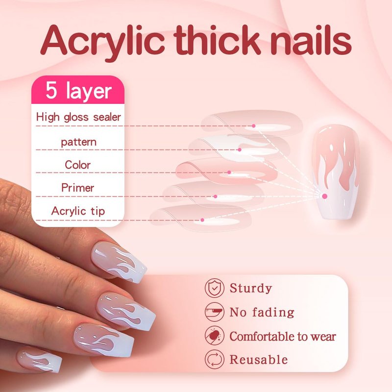 - 🌟more convenient and fast: acrylic nails press on are easy to put on and remove, with various styles, no longer need to waste a lot of money and time waiting in line at the nail salon, you can change the style of press on nails with charms anytime and anywhere within 15 minutes. white nails solve the problem of not being able to do nails in some special circumstances, such as work, school, pregnancy or short-term wear.