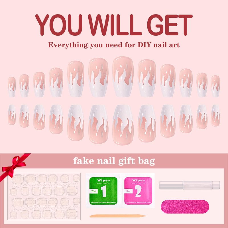 Yivaiks White Acrylic Press on Nails Medium Length Glue on Fake Nails Flame Stick on Nails Full Cover Artificial Nails Press ons Short Nails Kit 24pcs