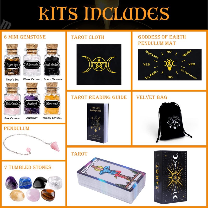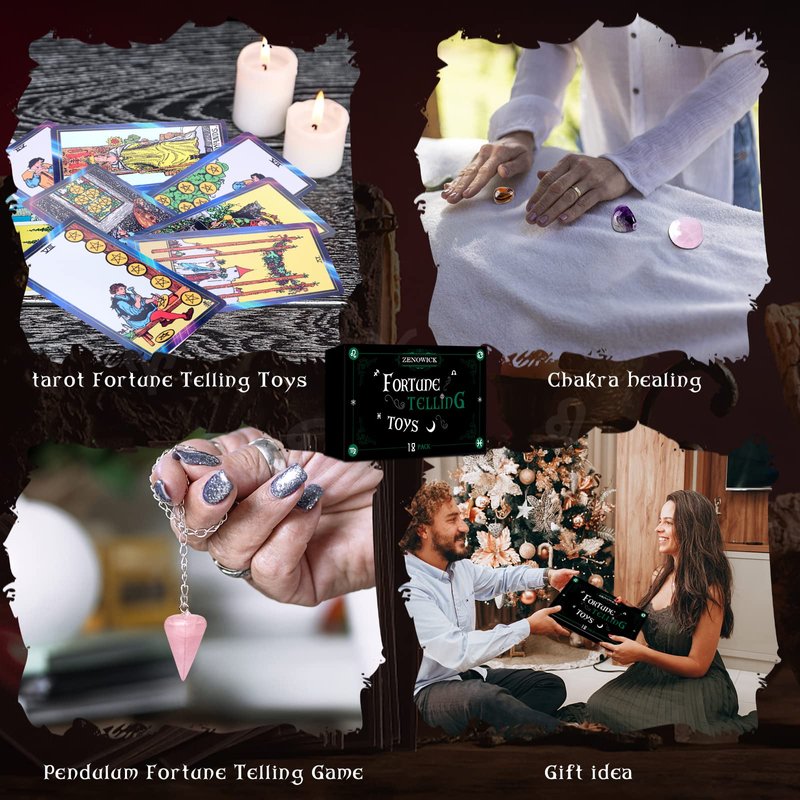 - Premium Fortune Telling Toys Set -- 18 Pcs Fortune Telling Toys Box Include 1 deck of 78 tarot cards 、6 Mini Crystal Spell Jars,7 Chakra Stones,1 Spirit Pendulum,1 Tarot Cloth ,1Goddess of Earth pendulum mat,1 Velvet Bag.