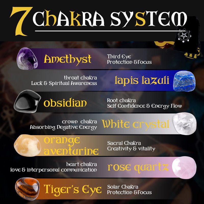 - 6 Mini Crystal Spell Jars And 7 Chakra Stones:6 Kinds Of Mini Crystal Spell Jars Contain 6 Kinds Of Gem Fragments, Namely Amethyst; Black obsidian; Pink Crystal; White Crystal; Yellow Crystal; Tiger’S Eye. 7 Chakra Stones Include: Clear Quartz; Amethyst; Lapis Lazuli; Rose Quartz; Tiger’S Eye; Black Obsidian; orange aventurine;Suitable For Beginners And Experienced Witches To Magic Altars, And Decorations In Life.