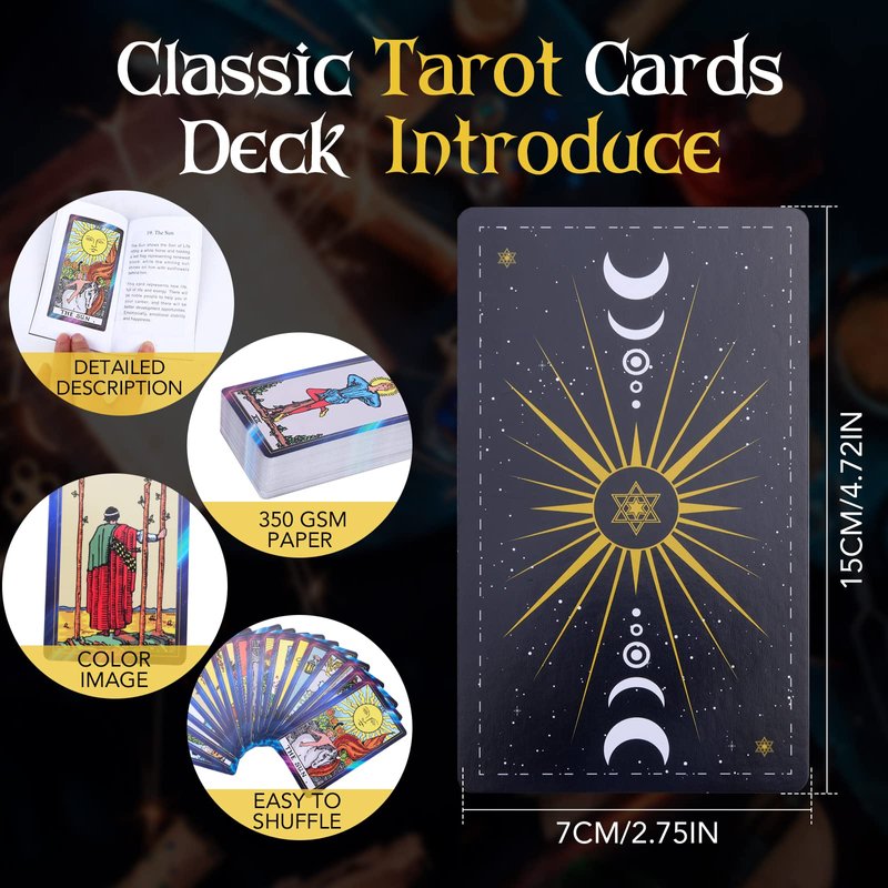 - 78 Tarot Cards Deck:Tarot cards are made of premium materials, very easy to shuffle, with great hand feel, with 78 different pattern designs, you can explore destiny with your friends in the world of tarot cards.Explore the yesterday, today and the future,perfect for beginners and tarot cards lovers.It patented by our company and have registered copyright.