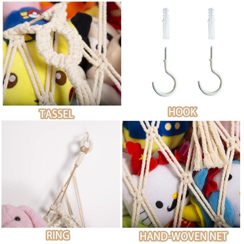 - 【Eco-Material,Handmade Gift with Love】The stuffed animal hammock is made of high quality macrame cotton cord, and was woven with love by our mom team artists. The macrame toy hammock will not loosen with time and change its shape. Our macrame stuffed animals display is environmentally friendly, safe and durable.At the same time, our macrame stuffed animal hammock add safety steel rings design to prevent stuffed animal net or hammock from falling and ensure you kids safety.