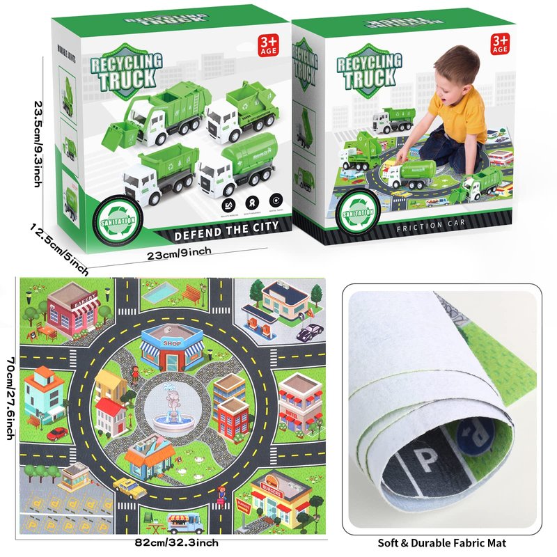 Y.L. DOYMX Toy Garbage Truck - Trash Truck Toys w/Play Mat, 4 Pcs 6 Inch Friction Powered Small Garbage Truck Toy, 8 Signposts, 4 Trash Bins with 108 pcs Trash Cards for Boys Age 3+ Toddlers Kids Gift