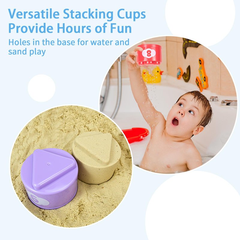 - Make It Playtime, Anytime!: These colorful stacking cups can be used in many kinds of play such as: stacking, nesting, shape sorting, bath toys, beach toys, and more. Stack them high, nest inside each other, or knock them down again and again indoor or outdoor.Create the craziest sand castles and towers at the beach. Kids can also use them to play in the water while bathing.