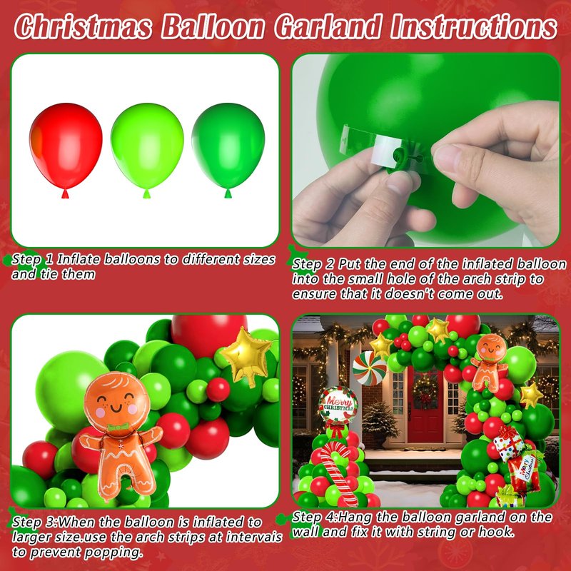 - Welcome to the wonderful Christmas party! Hurry up and decorate all kinds of Christmas parties with our Christmas balloon kits in rich and varied configurations, with all the elements you want, easily assembling stunning balloon arches that look great outdoors or indoors! What are you still hesitating? Let's celebrate all kinds of festivals and events with your kids and feel the charm and significance of the holidays!