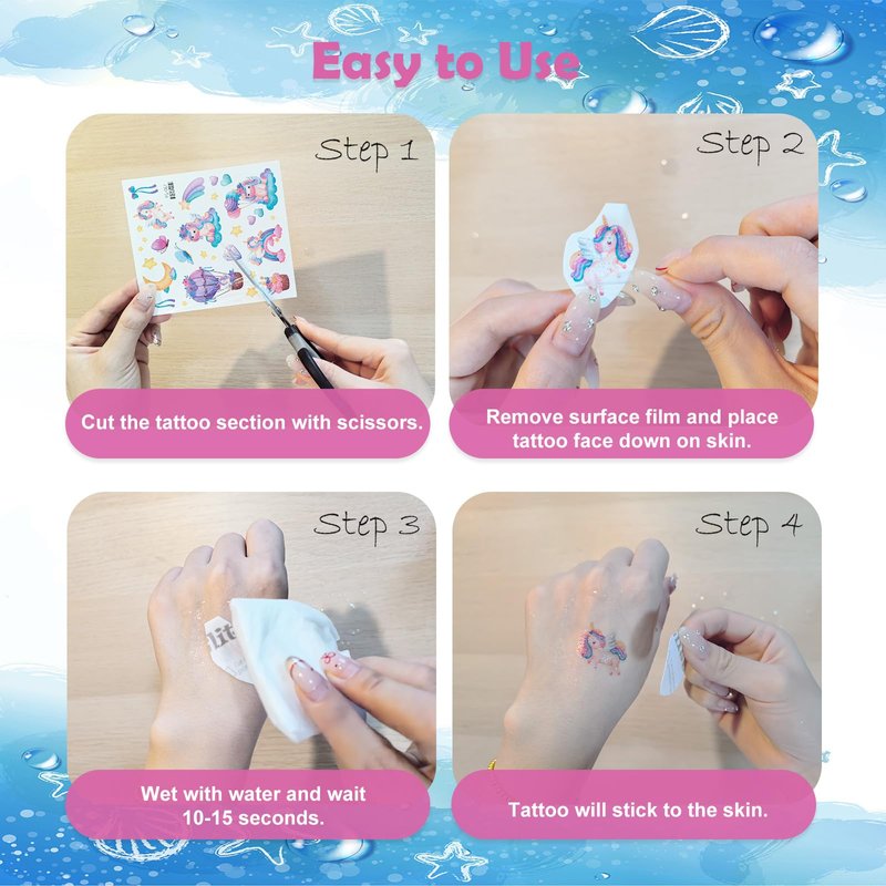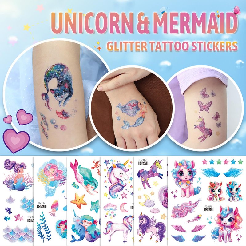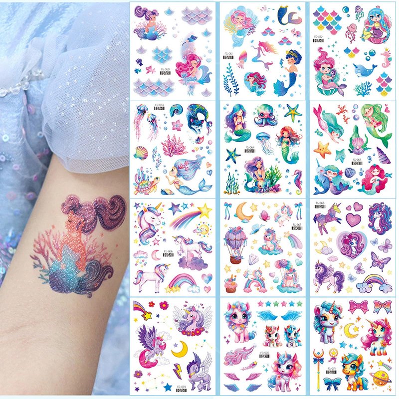 - Mixed Styles Temporary Tattoos for Kids:With over 240 Pcs of temporary tattoos featuring a sparkly glitter style, these assorted tattoo stickers come in various designs, perfect for girls' favor. From unicorns, mermaids, butterflies, and flowers, to vibrant designs like pearls, starfish, jellyfish, half-mermaids, seaweed, and shells, they feature many of little girls' favorite characters. They make for great fun at a butterfly theme party or as spring-summer activity favors.