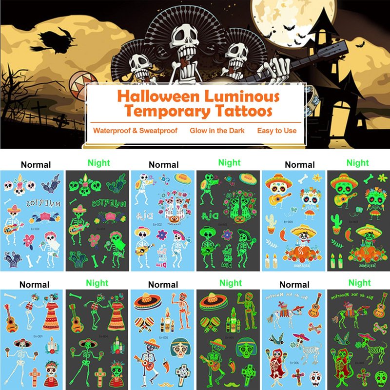 - Halloween-Style Temporary Tattoos for Kids: Luminous, glow-in-the-dark designs that let you shine even in a crowd of friends at parties! Our Yobbai temporary tattoos feature spooky ghosts, flying bats, and playful jack-o'-lanterns (or pumpkins) that kids adore. A beautifully curated set of tattoos adds an extra thrill to the trick-or-treating fun!