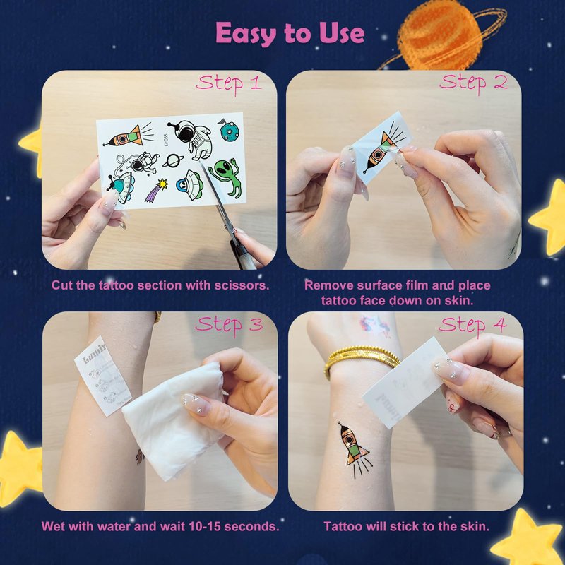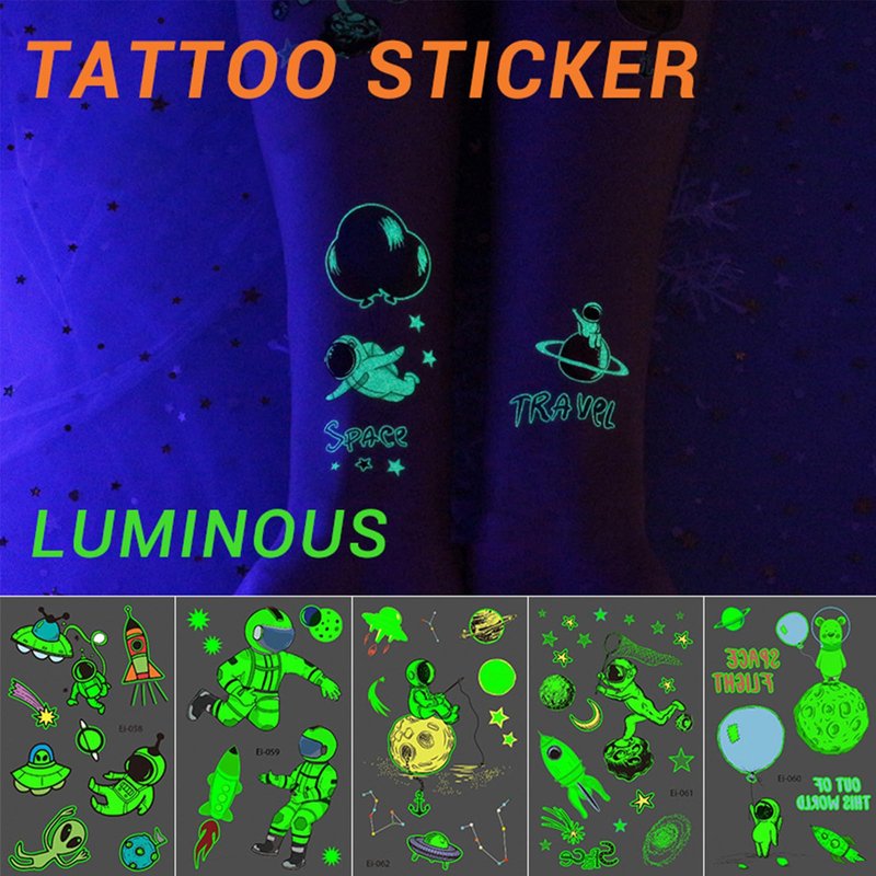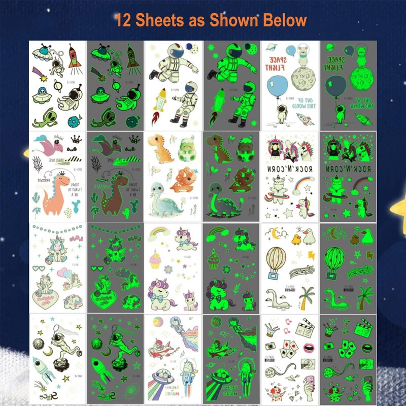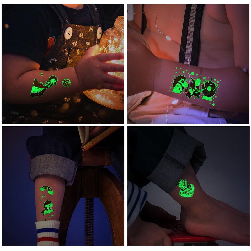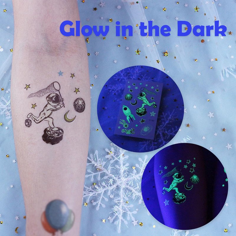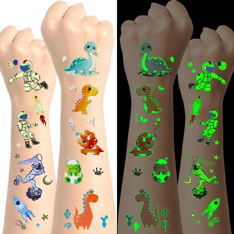 - Mixed Styles Temporary Tattoos for Kids:Luminous temporary tattoos for kids. Even at a party with lots of friends, the glow-in-the-dark tattoos will make you stand out in the crowd! These super fun elements of our temporary tattoos include spaceships, astronauts, aliens, unicorns, and dinosaurs that kids will love. A beautifully styled set of tattoos can cater to the needs of an entire children's party!