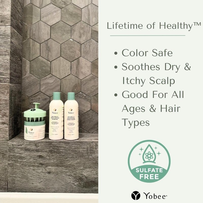 Experience the deep conditioning power of Yobee Naturally Nourishing Conditioner, a deeply hydrating addition to your Yobee routine. This rich, moisturizing conditioner is specifically designed to complement our Shampoo and the Scalp Mask. It promotes a healthy scalp microbiome, providing soothing relief to dry and sensitive scalps and repairing and revitalizing the follicles. Formulated to combat the discomfort of dandruff and seborrheic dermatitis, it's also the ideal itchy scalp solution for those who suffer from scalp psoriasis or scalp eczema. This conditioner is packed with natural ingredients that work together to soothe and heal your scalp, leaving your hair feeling thick, full, and revitalized. The Naturally Nourishing Hair Conditioner is enriched with PROBYOME, a patented blend of probiotic extracts that support a balanced microbiome, promoting a healthier scalp. Organic honey, organic turmeric, vitamin B12 and probiotic extracts, known for their natural healing and soothing properties, help reduce irritation, to fortify the health of your scalp. Cocos Nucifera (Coconut) Oil and Persea Gratissima (Avocado) Oil provide added nutrients and deeply conditions the hair, helping tame frizz and giving your hair manageability and a smooth, shiny appearance. The result? Healthier, shinier, and more resilient hair that is rooted in a healthy scalp.. Suitable for all ages and hair types, this sulfate-free conditioner is also free from phthalates, parabens, and other harsh ingredients. Yobee Naturally Nourishing Conditioner is your ally in achieving healthy and luxurious hair.