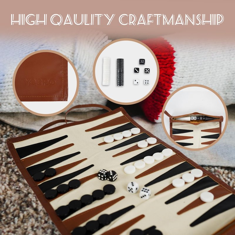 YOBRO Travel Backgammon Sets for Adults, Classic PU Leather Roll-Up Backgammon Board Game Gift for Kids, Portable & Lightweight Travel Style for Indoor Outdoor, Funny Family Game