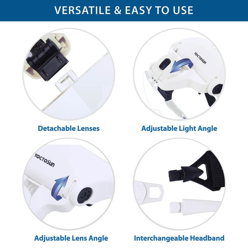 YOCTOSUN Head Mount Magnifier with 2 Led Professional Jeweler's Loupe Light Bracket and Headband are Interchangeable
