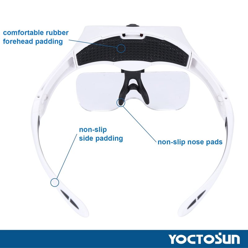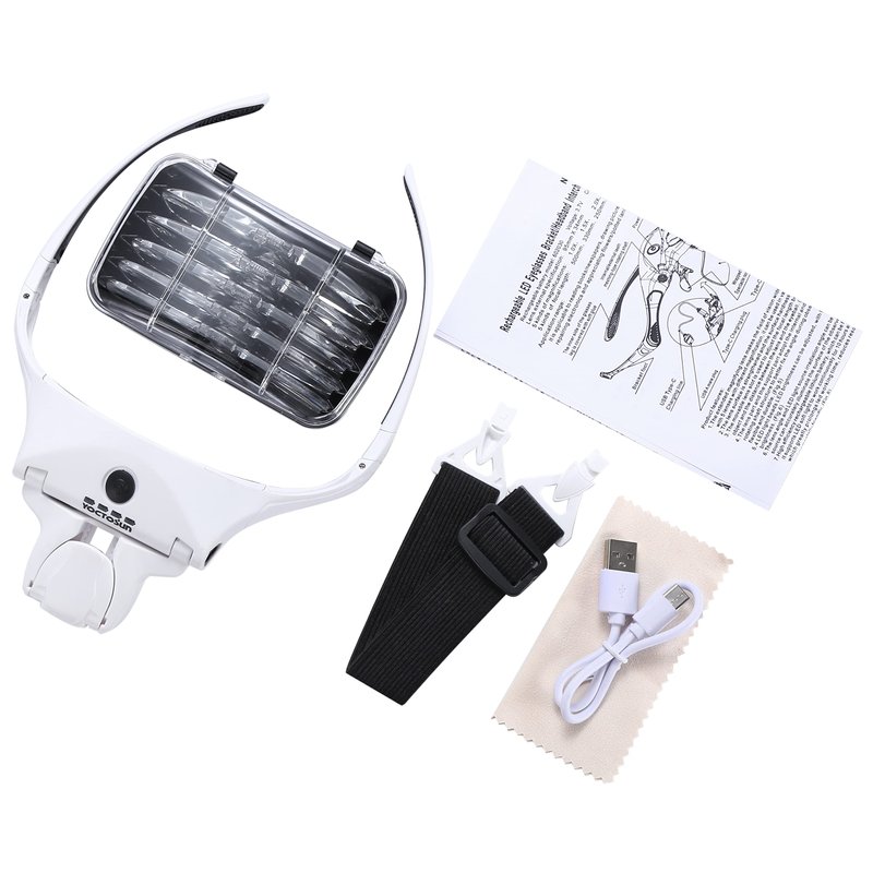 Four LED Lights with Adjustable Brightness Levels:There are two brightness levels which provide excellent light for illuminating detailed surfaces. Two levels of brightness are available by pressing the switch on the top of the headset magnifier. INTERCHANGEABLE LENS DESIGN: Switch between 5 optical lenses using a simple click and release system. Magnification power of the head magnifier: 1.0X, 1.5X, 2.0X, 2.5X, 3.5X. Scratch-resistant acrylic reduces weight. All lens come in a sturdy storage box to keep them organized and protected. USB Charging Design:This magnifying glasses with light is equipped with a rechargeable built-in lithium battery and comes with a USB Type-C cable, simply plug the cord into the magnifier and the other end into the slot of a USB power source(such as a USB wall charger, a cell phone charger or a power bank, not included) and it automatically charges. Save money and energy while enjoying long lasting bright light. You will never need to buy batteries again! COMFORTABLE AND EASY TO USE: Comfortable eyeglass frame with newly designed nose bridge holder which can greatly lighten the load on the bridge of the nose. Alternate between wearing it as glasses or headband. The included head strap can be attached with ease to ensure a more secure fit. Adjustable LED Magnifying Glasses; The light mount on the magnifying visor can be adjusted to change the angle of light to suit the task at hand.The lens angle and lens distance is also adjustable.