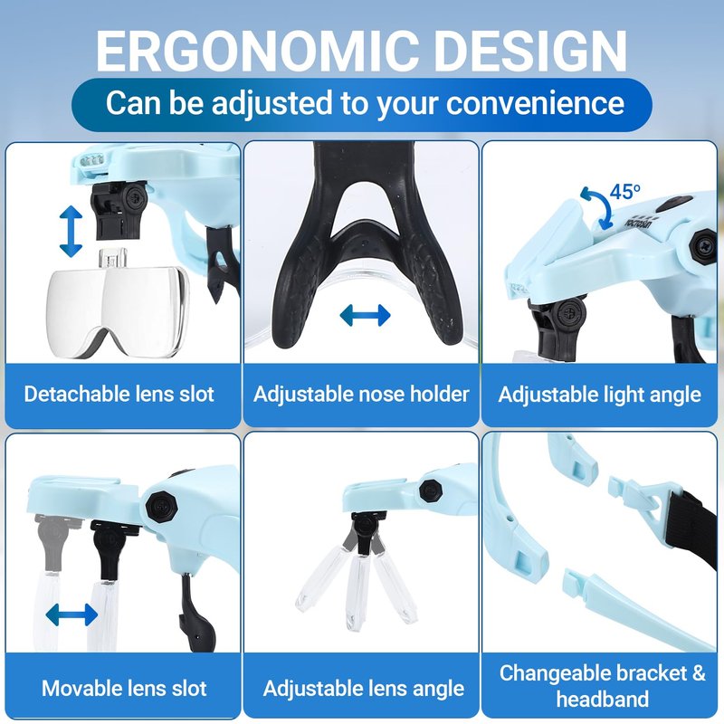- Adjustable LED Magnifying Glasses; The light mount on the magnifying visor can be adjusted to change the angle of light to suit the task at hand.The lens angle and lens distance is also adjustable.