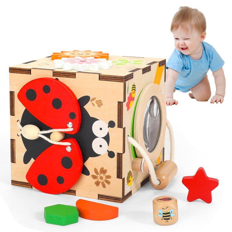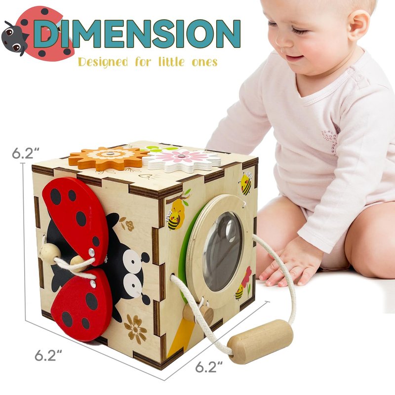 YODIFFMI Wooden Activity Cube Montessori Toys for 3 Year Old Baby Toys Toddlers Birthday Gift Boys Girls Sensory Interactive Learning Toys (Ladybugs)