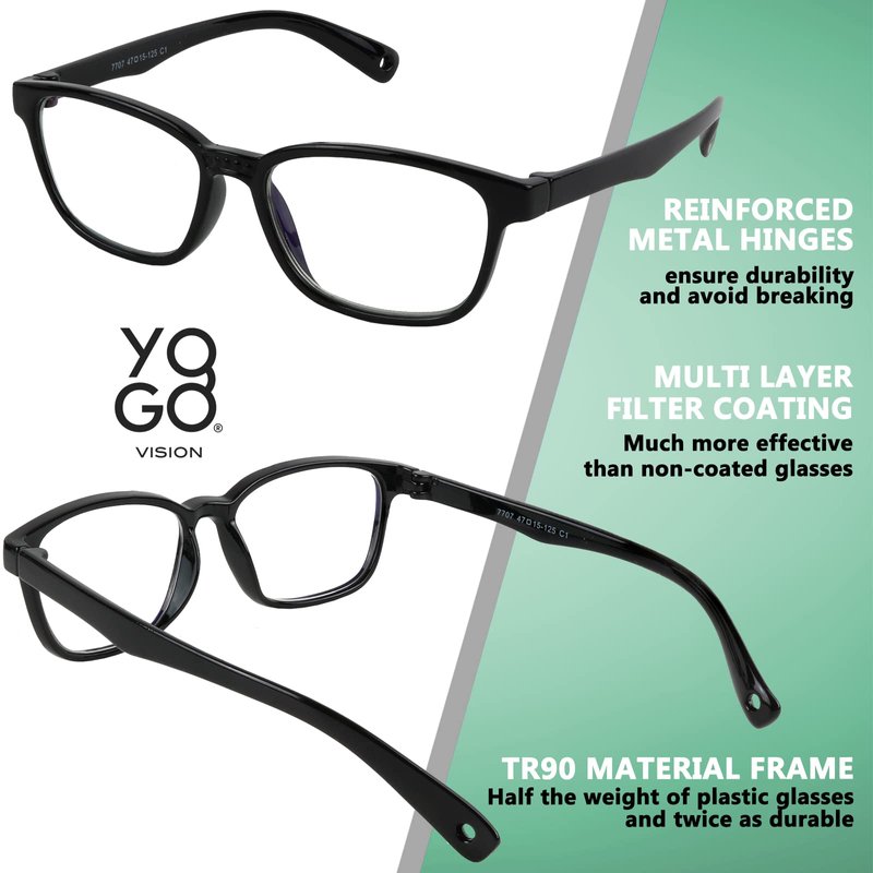 Yogo Vision Blue Light Blocking Glasses are designed to reduce the glare, and block 99% of blue light that comes from screens.√ Long Term Eye Protection – Too much exposure to blue light can lead to digital eye fatigue, squinting, headaches, and myopia. Protect your child’s eyes with a pair of blue light blockers. √ UV protection – The Anti-Blue light lenses will also protect the eyes from harmful UV rays. Your kid can benefit from using them indoors as well as outdoors. √ Super Cute Colors – Kids of all ages won’t be able to resist picking out a pair of fashionable, fun and super cool blue light glasses. √ Lightweight, Comfortable Frames – Frames are made of ultra-light plastic, ensuring comfort for your child. They won’t feel any pressure on the ears, or the bridge of their nose. √ Hard Case Included - Stow the hard-plastic case in your kid's backpack and protect these gaming glasses from dust, damages, and sticky fingers. Technical Specs:Lens: 46mm Bridge: 16mm Temple: 125mm Yogo Vision frames are available in blue, light blue, green, purple, and pink. Both boys and girls will love showing off their unique style. Flexible hinges and durable frames will stand up to kids rough treatment. Yogo Vision We Take Your Child’s Vision Health Seriously. Here are some ways blue light blocking glasses can help your child: ✔️ Reduce Digital Eye Strain ✔️Lessen Long Term Vision Damage ✔️ Prevent Dry Eyes and Straining ✔️Sleep Better without interrupted Sleep Cycles ✔️ Minimize Headaches ✔️ Increase Focus and ConcentrationSatisfaction Guaranteed – Scroll Up to Add to Cart