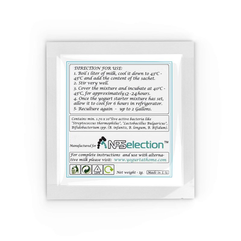 - One sachet is enough to make 1 quart of plain, mild in taste yogurt and re-cultured after