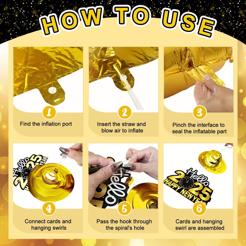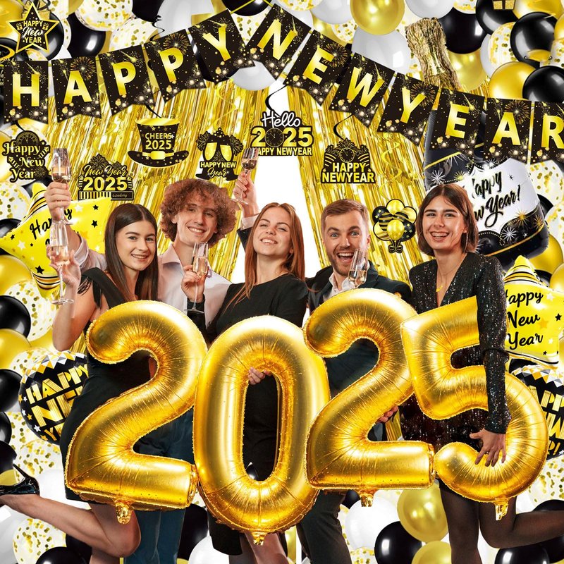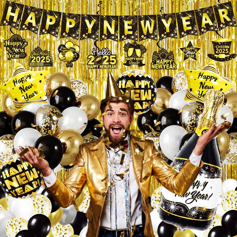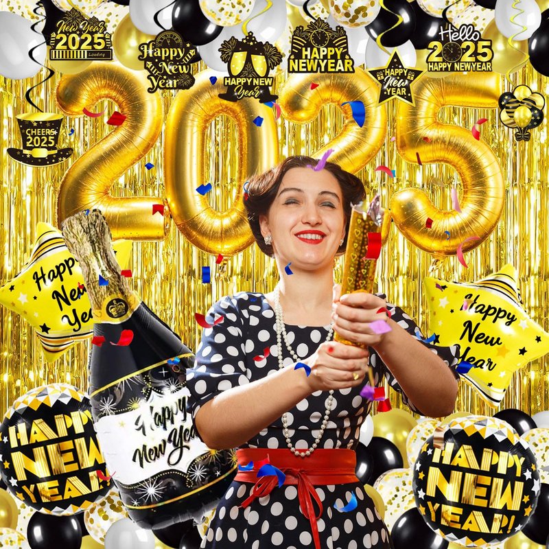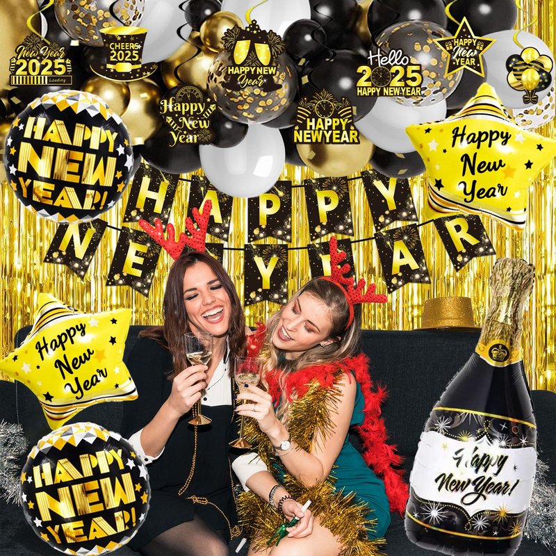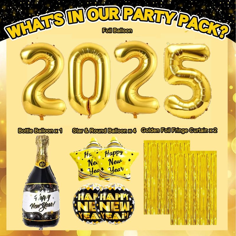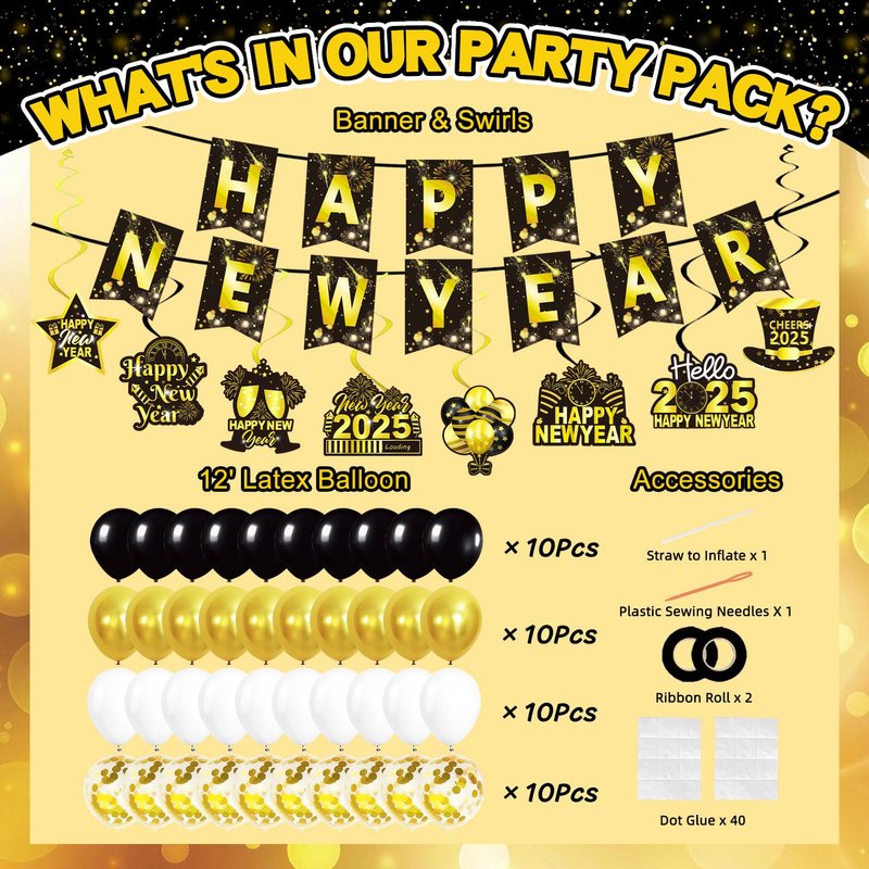 - New Year Set Luxury: We are ready with everything you need for your New Years Eve party: 66pcs set including Happy New Year Banner*1, Gold Foil Fringe Curtains*2, Number Foil Balloon*4(2025), Champagne Bottle Foil Balloon*1, Gold Star Foil Balloons*2, Black Round Foil Balloons*2, Black Latex Balloons*10, Gold Latex Balloons*10, Silver Latex Balloons*10, Confetti Balloons*10, Hanging Swirl Decorations*8, ABS Plastic Sewing Needle*1, Inflatable Straw*1, Ribbon*2, Dot Glue*2.