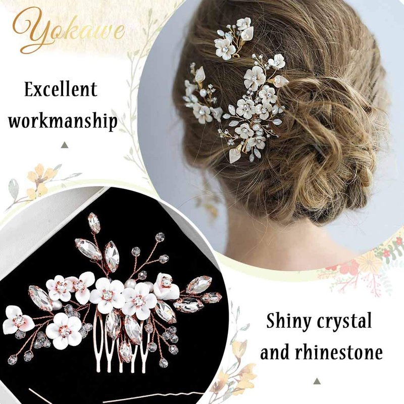 Yokawe Bridal Wedding Hair Comb Rose Gold Rhineston Bride Side Combs Crystal and Flower Hair Accessories for Women and Girls