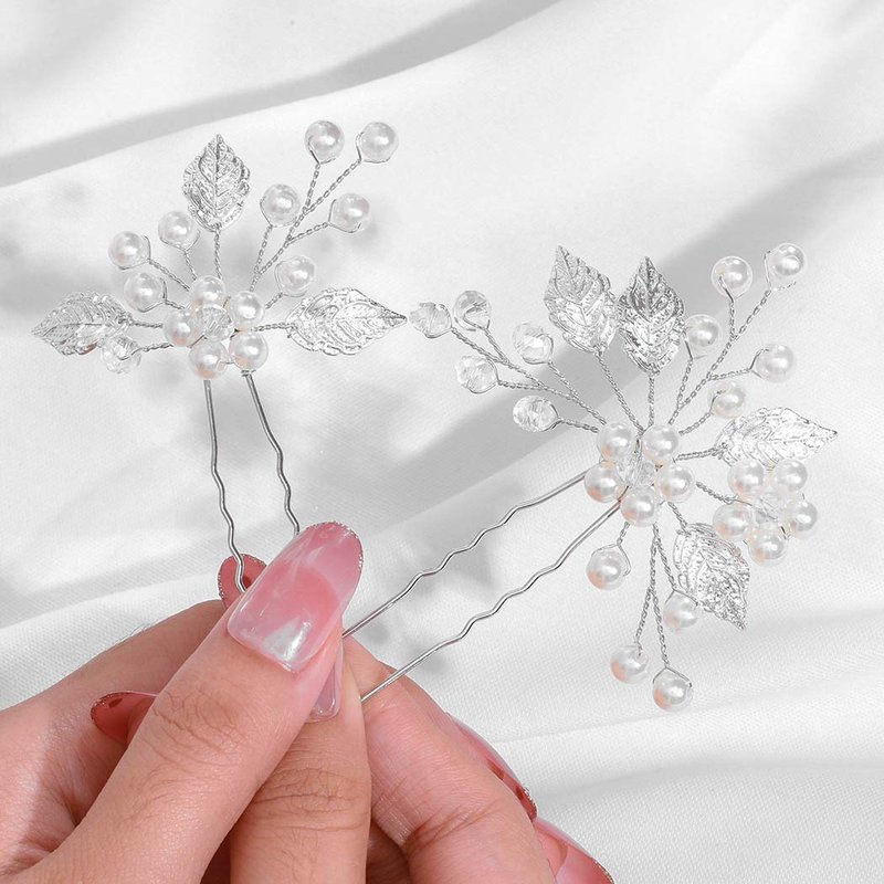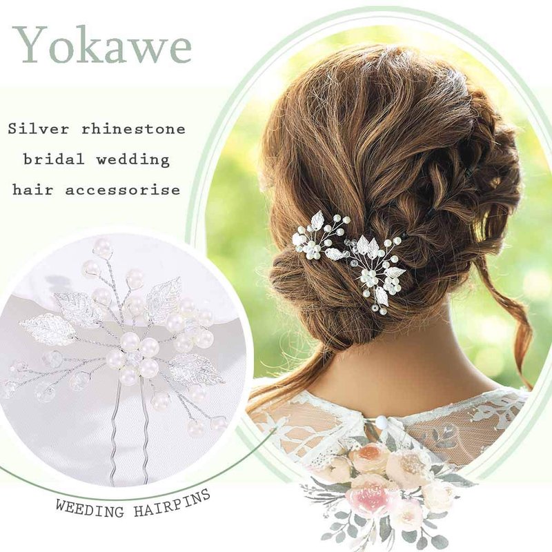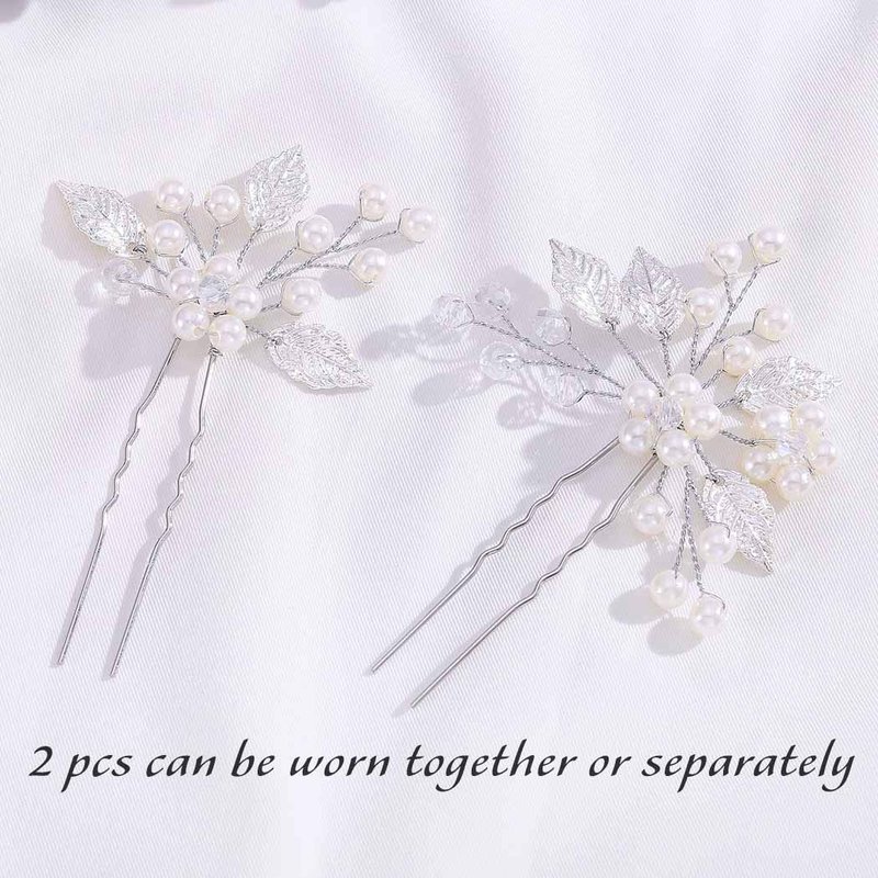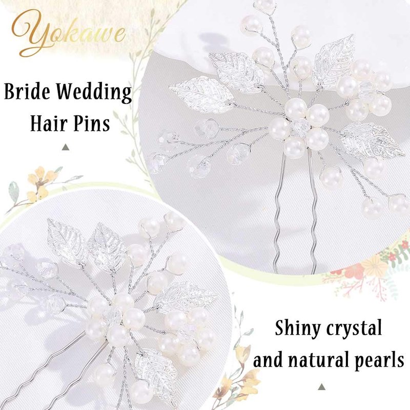Yokawe Bridal Wedding Hair Pins Silver Pearls Bride Hairpin Crystal and Leaf Hair Accessorise for Women and Girls(2 PCS)