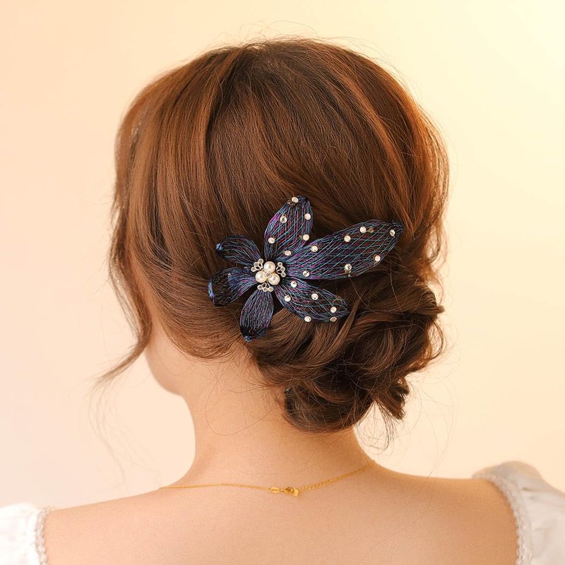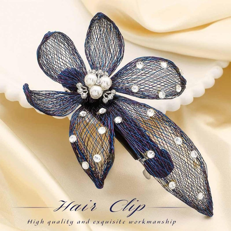 This hairpin is handmade, with wire mesh rolled into the shape of a flower and embellished with rhinestones and pearls.