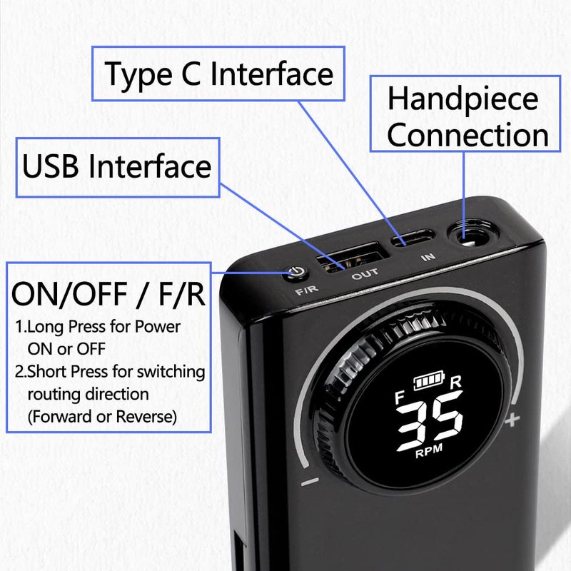 - [ HD LCD Display with Long Battery Life&Power bank ] This electronic nail machine which can last 12 hours after 2 hours fully charged. After charged you can also use it as a power bank when your phone need power off.The HD LCD Display on the drill machine shows the speed and the remained battery level, which is convenient for you to adjust the speed and to remind you of charging.
