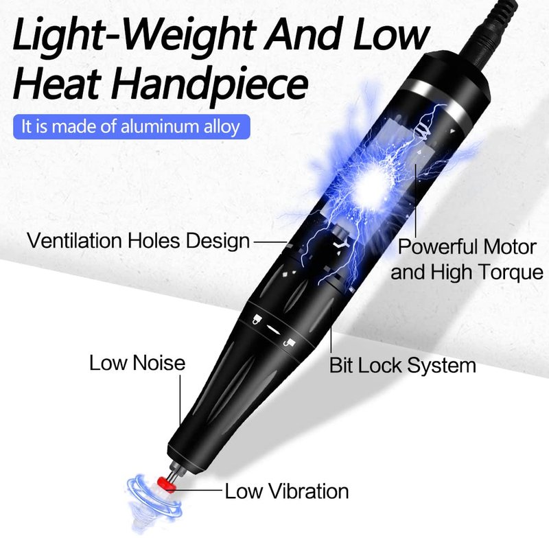 - [Portable&lightweight design,Double pen holder] The drill machine size is 5.51’*2.91’*1.1’inch and The drill machine with pen just 380g, inch you can take it and put it in a bag very easily.This nail drill machine comes with a hook on the machine which could hang on your clothes, or put it in your pocket or bag.The drill machine also has two pen holders for easy work in different positions.