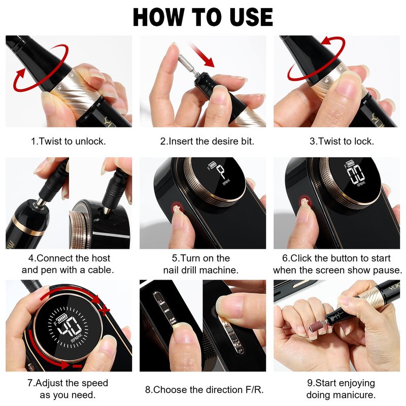 - [HD LCD Display]: Equipped with touch-sensitive buttons are integrated with the body of the efile nail drill, it is very easy and convenient to use. The smart LCD Display show clearly RPM and accurate battery for you.