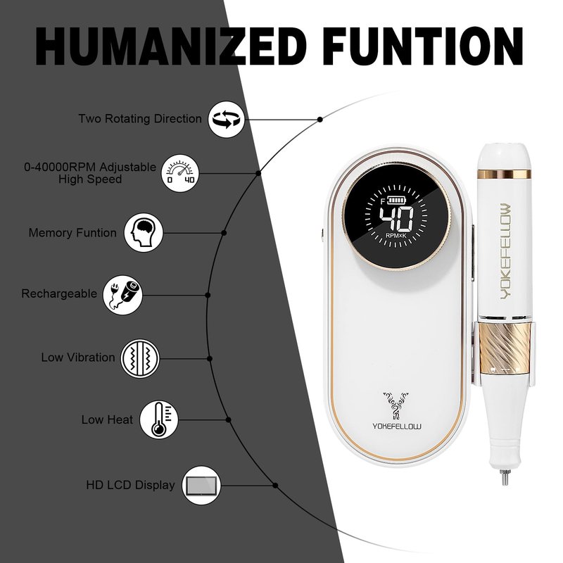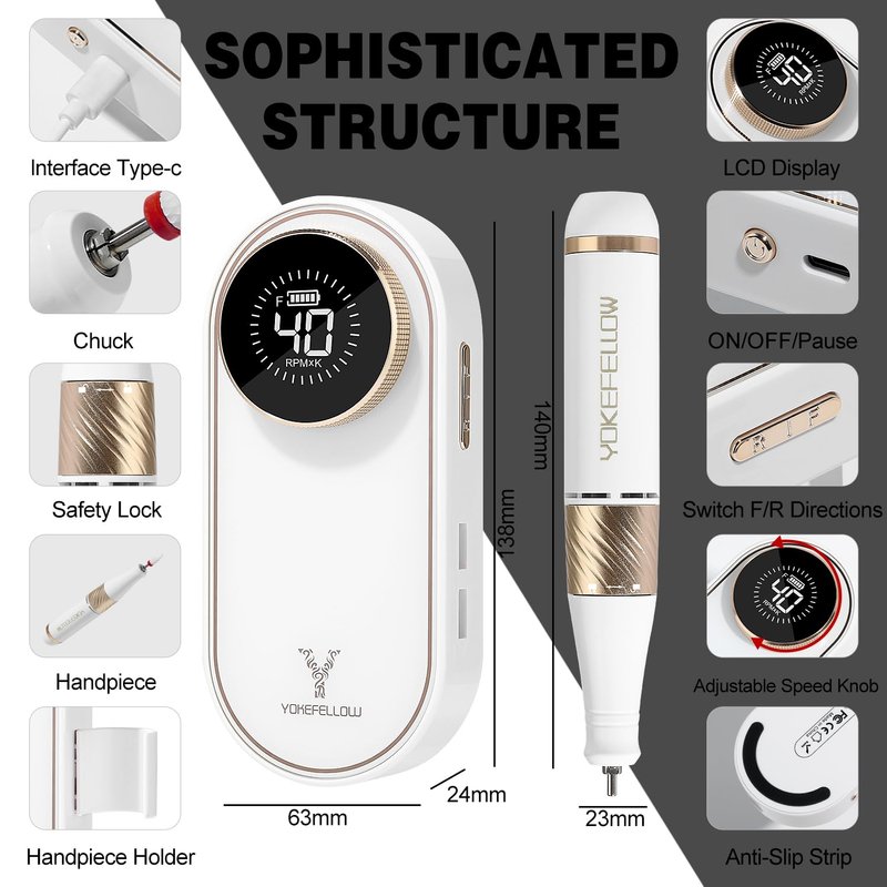 YOKE FELLOW Electric Nail File - 40000 RPM Rechargeable Nail Drill Machine Nail File with 12 Nail Drill Bits for Manicure Pedicure Acrylic Polishing Tools Kit for Salon Home Use