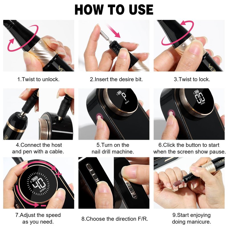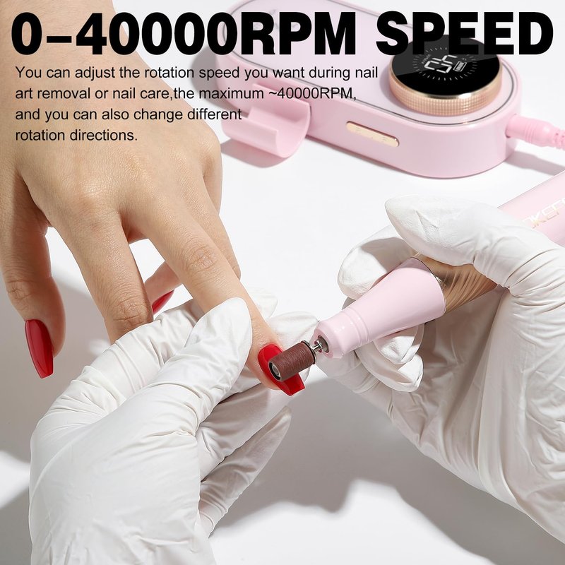 - [Speed control]:0-15000RPM is good for removing dead skin and cutincl,grinding,shaping and polishing natural nail .15000-25000 RPM is good for removed the gel nail polish.25000-40000RPM is for acrylic nails and more professional manicures in a nail salon