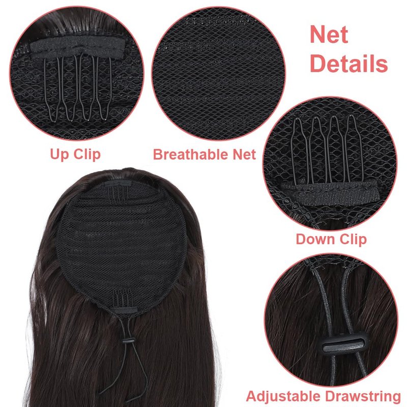 - 2.Drawstring Design:The ponytail extension is used breathable large mesh, wrapping strong, can be wrapped in a variety of length and thickness of the ponytail.