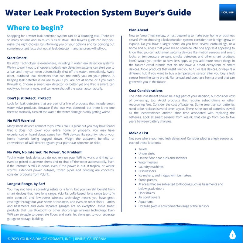 - SET IT & FORGET IT! Installs in seconds! The YoLink wireless Water Sensor could not be easier to install; just place near or under the equipment you wish to monitor. Suggested uses are near or under, toilets, water heaters, laundry machines, dishwashers, sinks, fish tanks, in or near sump pumps, and by any other location subject to water leaks and flooding.