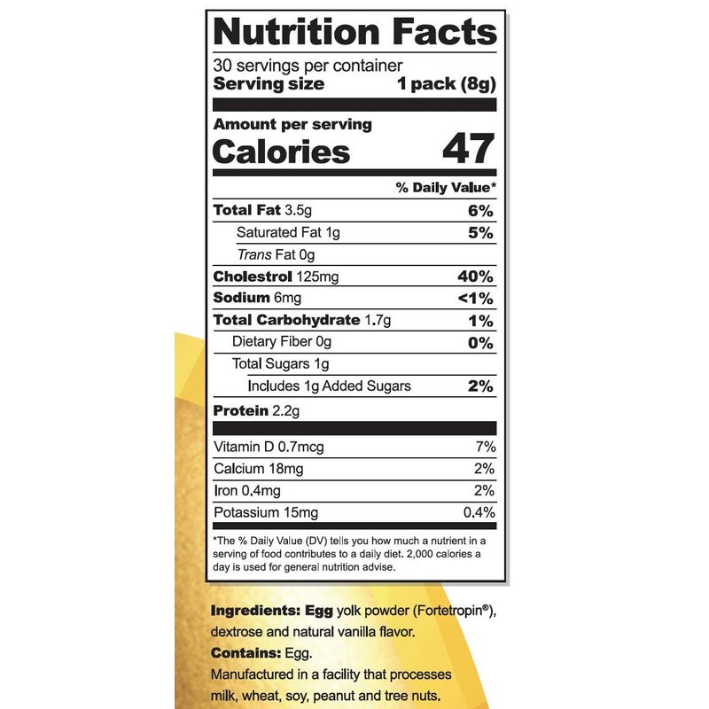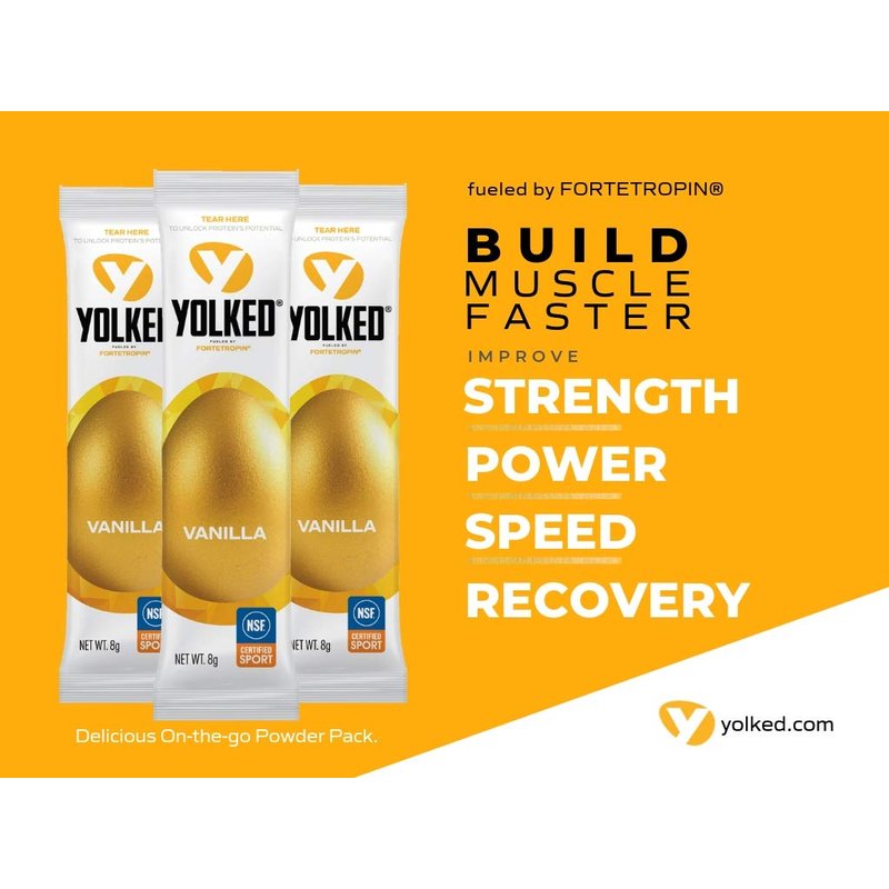 YOLKED – Muscle Enhancement Redefined. If you train hard and eat well, YOLKED is an all natural muscle growth supplement to your diet. The advanced muscle health formula helps unlock protein’s potential and increases the efficiency of your body’s protein utilization to build muscle naturally. Ideal for anyone who works hard to get better results in the gym, this revolutionary natural muscle building breakthrough is also ideal for athletes of all levels. YOLKED supplement is perfect for personal trainers, athletes, the crossfit community and anyone looking to increase strength when recovering from injury. The muscle enhancer powder is offered in small, individual servings - just one packet of the bulking supplement per day can help you break through your fitness plateau for astonishing muscle building & growth results! Simple, Natural Ingredients. YOLKED is powered by Fortetropin, a revolutionary ingredient made through a patented process that maintains the powerful and vital nutrients of fertilized egg yolks to build more lean muscle. Fertilized egg yolk has unique complex molecules that increase natural muscle building and decrease muscle loss. YOLKED is anatural muscle growth supplement that contains 3 simple ingredients: fertilized egg yolk powder, dextrose and natural vanilla flavor. Certified,backed by science Sports Supplement. YOLKED is a muscle enhancer which has been shown to build muscle fast. Clinical study documented building up to 8 lbs of muscle mass in just 12 weeks! YOLKED muscle builder is also NSF Certified so you can feel safe knowing you’re taking a natural muscle building supplement that won’t impact drug testing. Additionally, as a result of NSF Certification, YOLKED has been accepted into a number of collegiate athletic programs. Protein’s perfect partner, YOLKED advanced nutritional supplement is the missing piece for your natural sports nutrition regimen. Ingredients: Egg Yolk Powder (Fortetropin), Dextrose and Natural Vanilla Flavor.