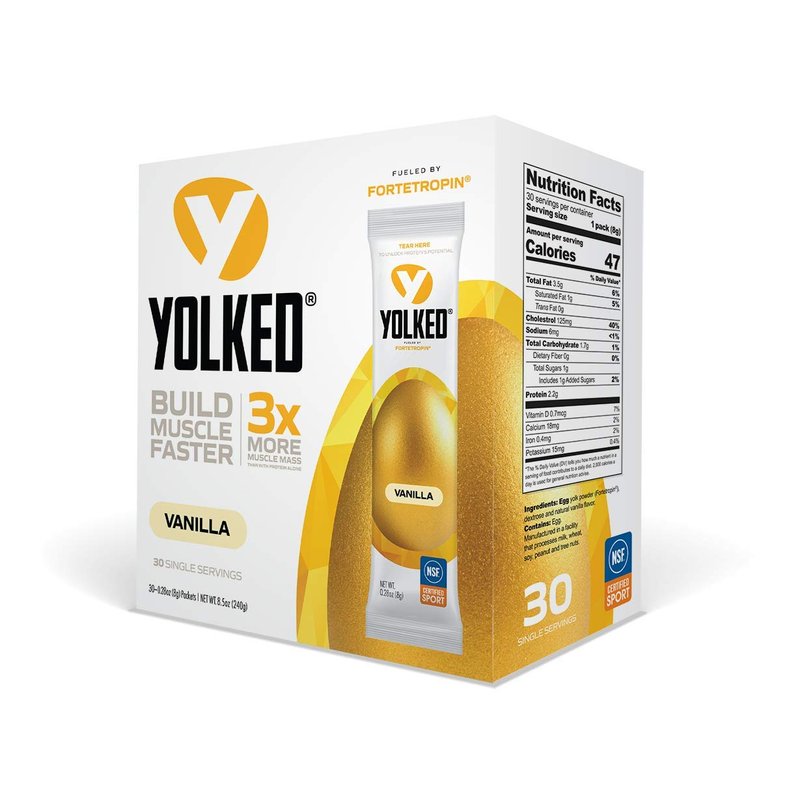 - BUILT FOR THE GYM: Each box of YOLKED Supplement contains 30 individual pouches of vanilla flavored Fortetropin, so you get a month of pocket-sized powder ready for your gym bag.