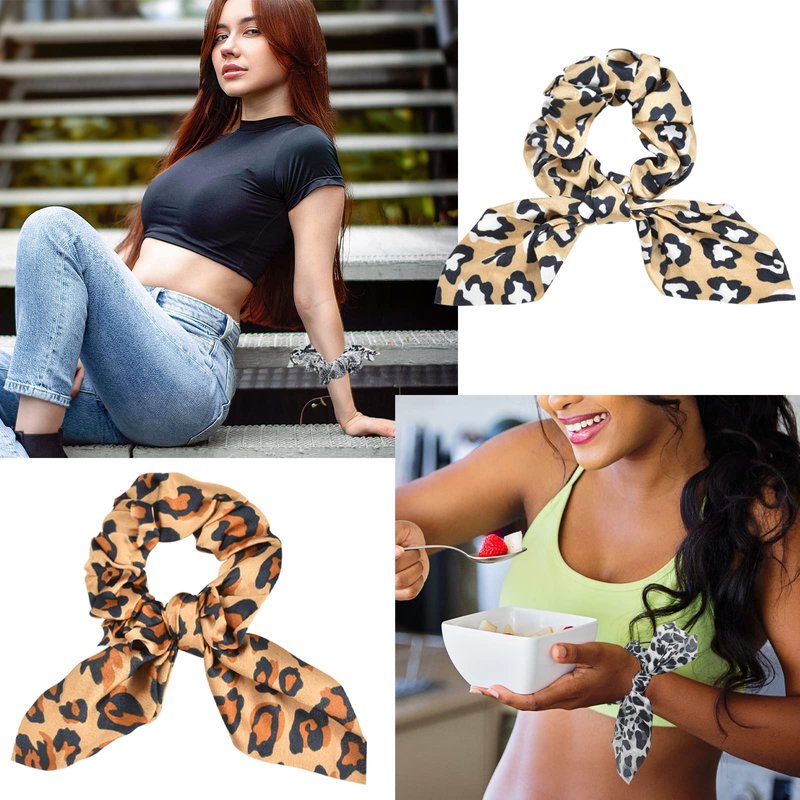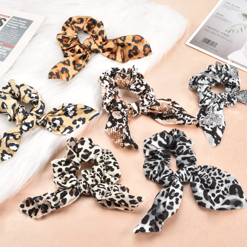 Yonchic 6-Piece Satin Bowknot Elastic Hair Ties, Animal Print Leopard Scrunchies Ladies Long Lasting Braids Ponytail Holders, Soft Elegant Bow Hair Tie Ribbon Rubber Bands Hair Accessories