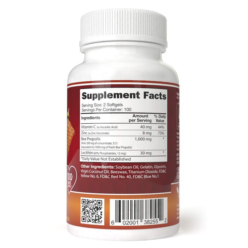 - Made with high concentration bee propolis extract, 1000mg per dosage. Fortified with Vitamin C, Zinc, and Lecithin to provide max immune system support