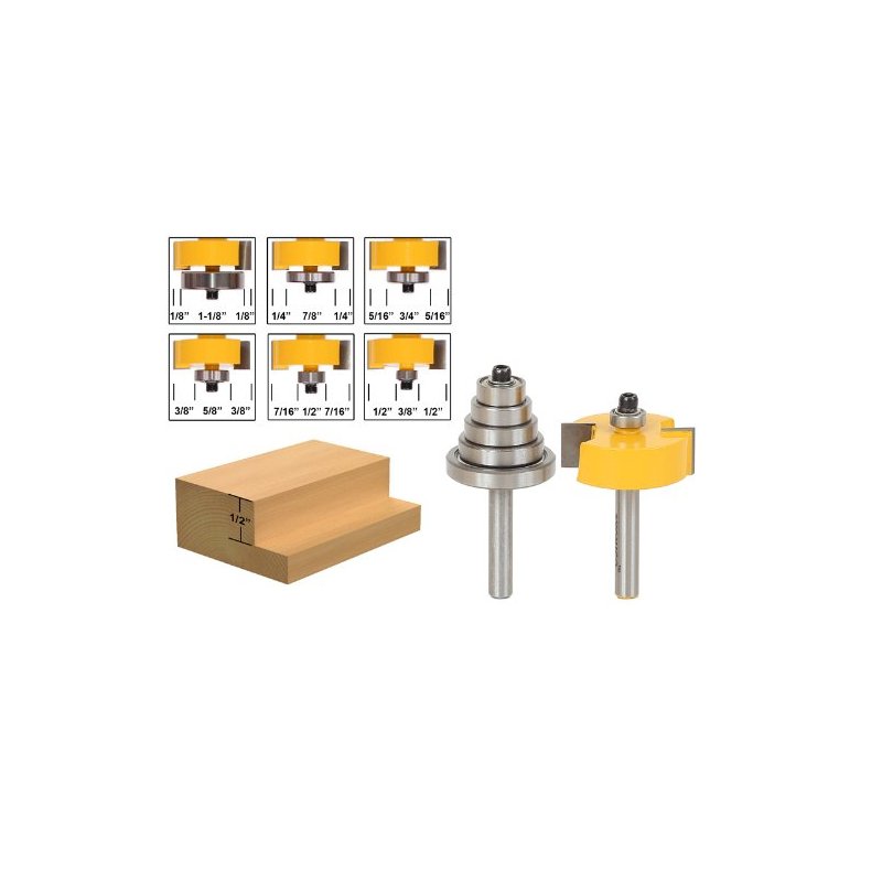 - Includes 1/2" rabbet bit with 6 bearing for cutting depths of: 1/8", 1/4", 5/16", 3/8", 7/16" & 1/2". 1/4" shank.