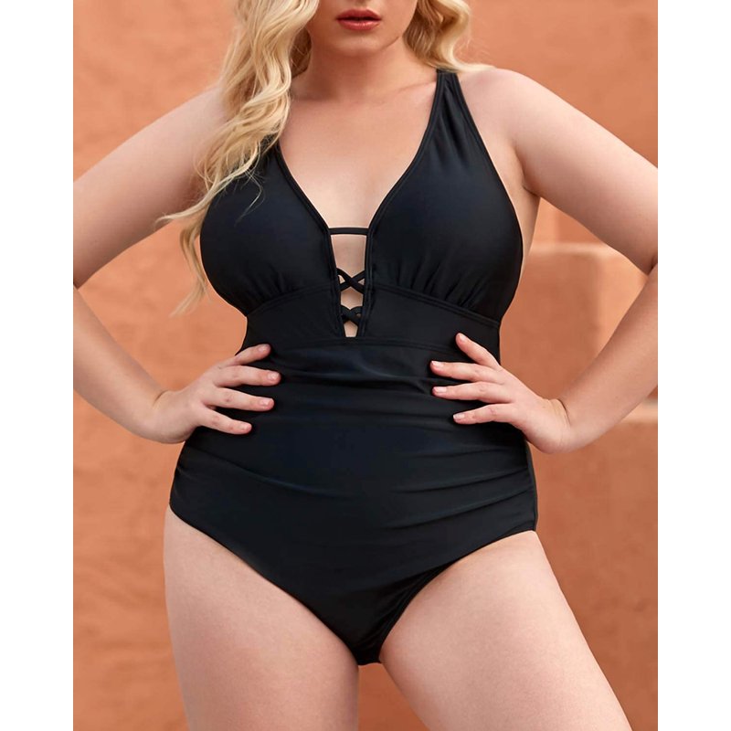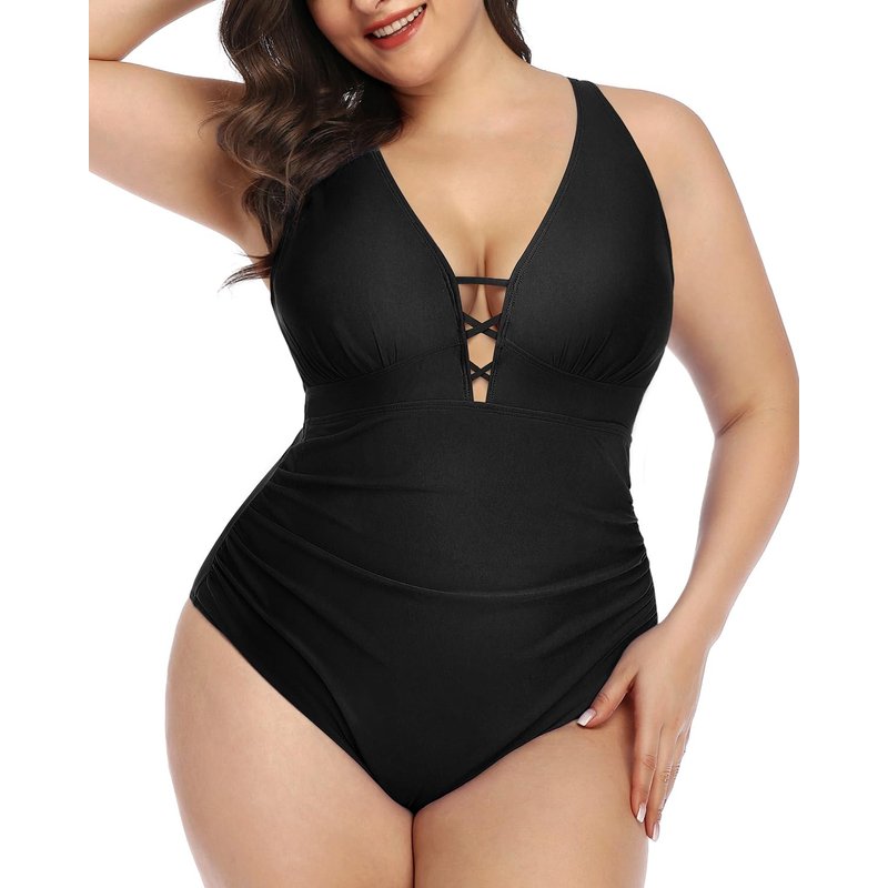 - Plus Size One Piece Swimsuit: This plus size bathing suit features a deep V-neck, lace-up front, and criss cross back, giving you a super stunning look.