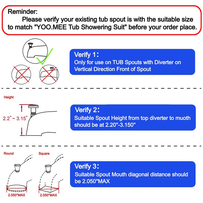 ** Only Suitable For the Tub Faucet Height From Top Diverter to Outlet Mouth at 3.150'' MAX and Tub Spout mouth Diagonal Distance at 2.050'' MAX.